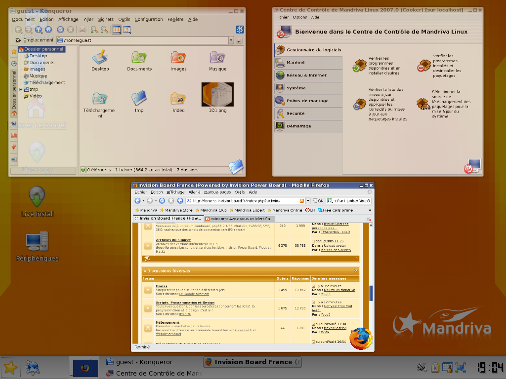 En vadrouille ce weekend chez mes parents dans la Beauce profonde, j'ai eu la bonne idée d'embarquer mes deux CD Live KDE et Gnome de la Mandriva 2007 RC 1. Quoi de mieux pour tester ces CD qu'un bon ordinateur bas de gamme acheté chez Leclerc ?
