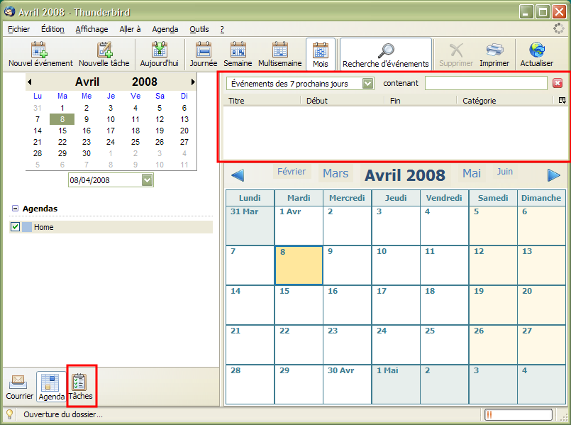 - Ensuite c'est l'apparition d'un cadre au dessus du calendrier qui affiche de base les événements des 7 prochains jours.