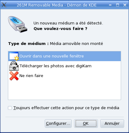 Dans le même esprit, l'insertion d'une clé USB fait apparaître une boite de dialogue demandant l'action que vous souhaitez réaliser. De plus une nouvelle icône fait son apparition dans le systray pour gérer la clé, avec notamment la fonctionnalité pour enlever la clé en toute sécurité.